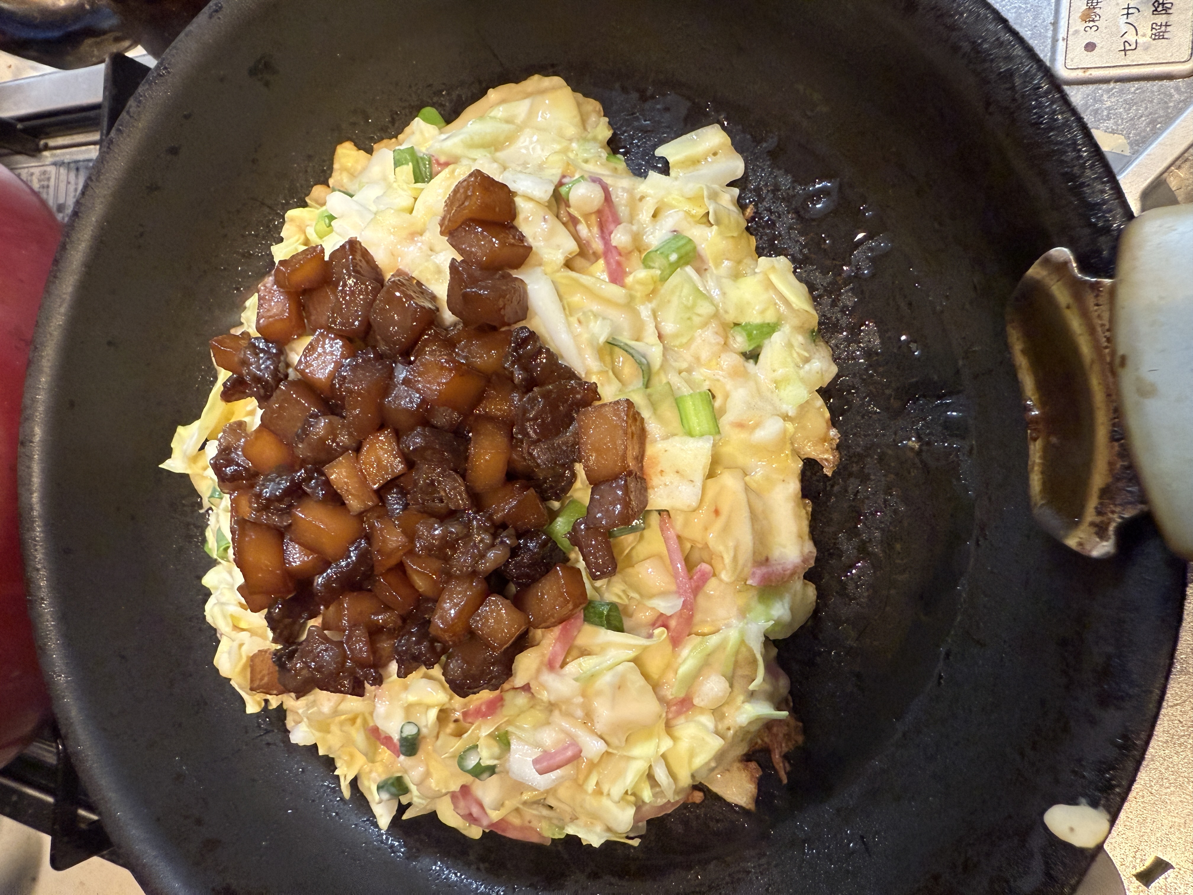味を調整しながらも、ようやくお好み焼きが完成しました。